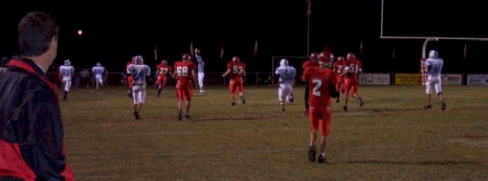 Freshman #24 Josh Hawkins, ripped off a 78 yard gold rush in the third period; and the final score was by #22 Cody Wiggins for 5 yards in the fourth stanza. Plenty of underclassman logged playing time. The Big Red defense throttled the Eagles, with the two INTS and sacks by #52 Matt Brown, #63 Lee Sarten, and #81 Adam Russell; the Eagles were kept on their heals the entire game.