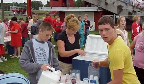 2004 1st Annual Family NightBy Jeff McQueen Question: How do you get 300 hotdogs to disappear? Jeff Harig, Head coach of the Loudon Redskins, had a pretty good idea... Invite the football team and their families! With team and individual pictures being taken, annual Redskin Football Booster Club meeting and election of officers as well, it just made good sense to feed everyone. A very family oriented atmosphere complemented the cool evening as the aroma of sizzling ‘dogs on the grill waffled through the air. The Booster Club provided the chefs as the coaching staff mingled with the parents. An added bonus was the Lady Redskin soccer team hosting the Lady Dragons of Clinton in a scrimmage game. A good time was had by all.